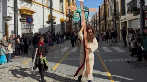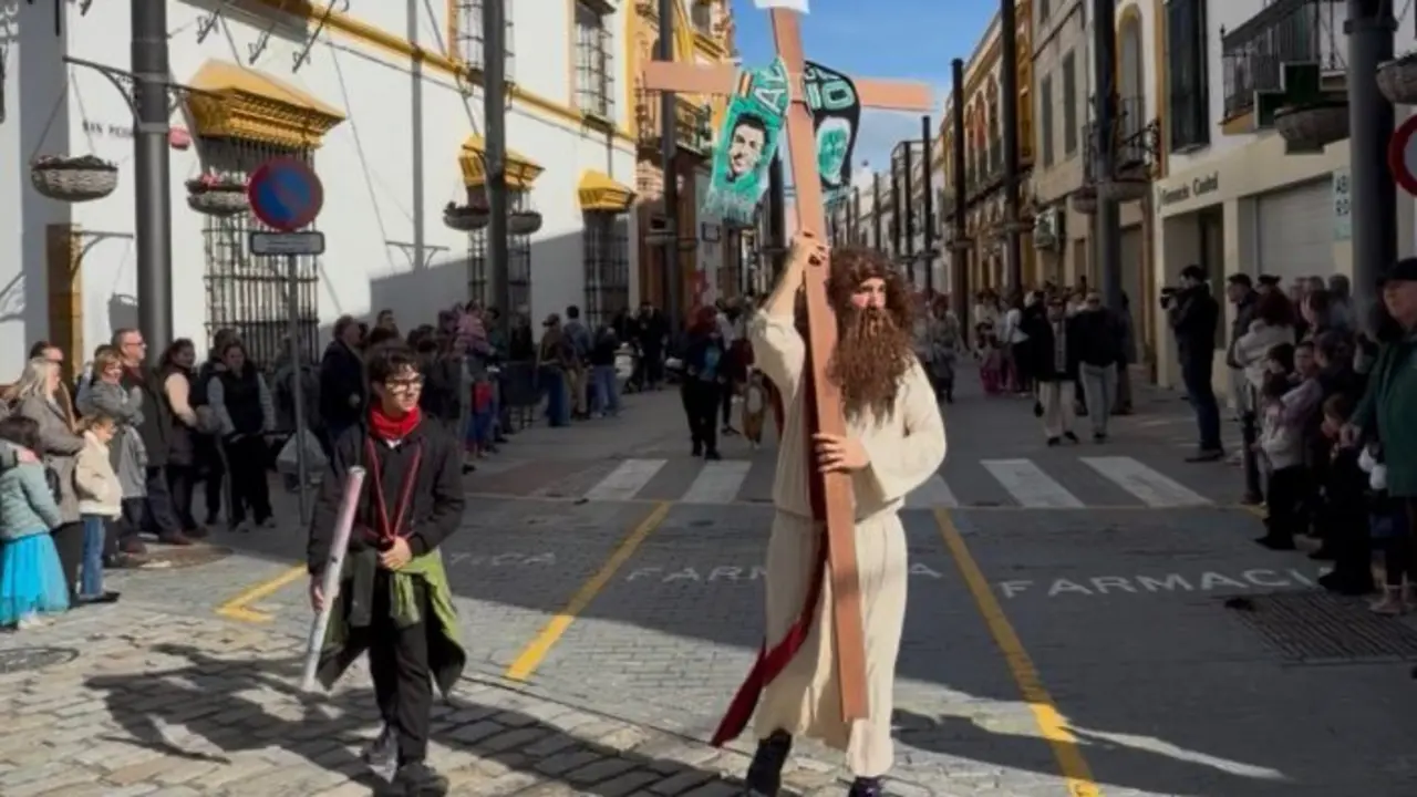 Marchena Una persona disfrazada de Jesucristo portando una cruz y una bufanda de Fernando Alonso durante el pasacalles provoca un debate social en Marchena J.J. Sarabia RSS 11/feb/26