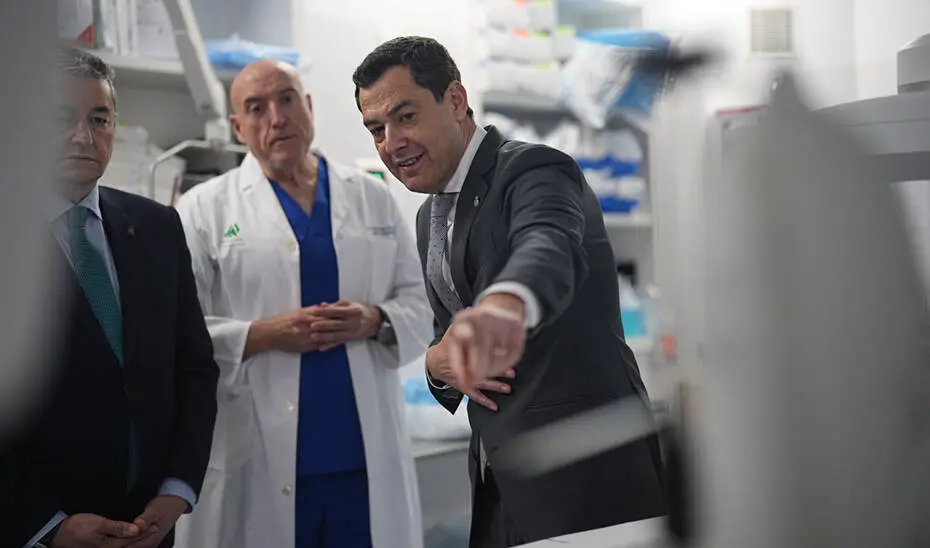 El presidente de la Junta, Juanma Moreno, durante su recorrido por las instalaciones del Hospital Virgen del Rocío de Sevilla.