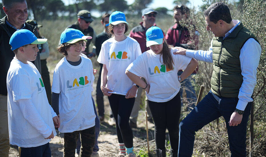 Foto de familia de Juanma Moreno con los jóvenes que participan en una plantación de árboles en el paraje de 'Las Peñuelas', dentro del Espacio Natural de Doñana.