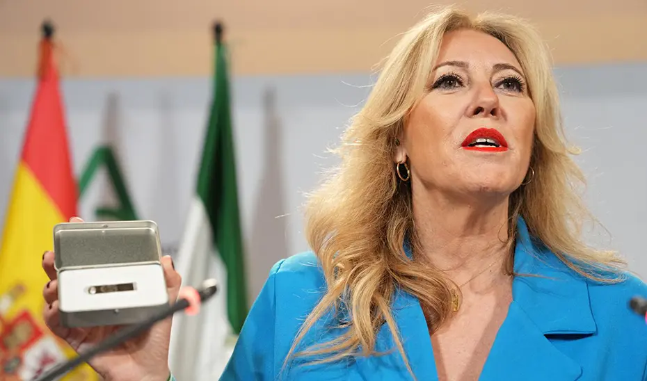 España, portavoz del Gobierno de la Junta, muestra un 'pendrive' con el Proyecto de Ley de Presupuestos de la Comunidad Autónoma de Andalucía para 2026.