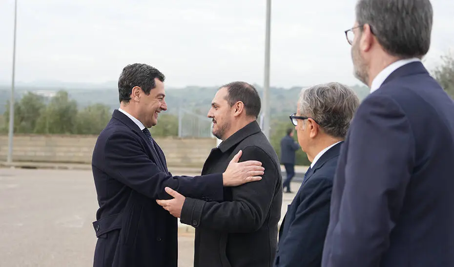 El presidente andaluz, Juanma Moreno, saluda al alcalde de Adamuz, Rafael Moreno.