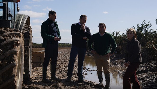 Juanma Moreno y Christophe Hansen observan los daños en zonas agrícolas de Jerez de la Frontera (Cádiz) afectadas por el tren de borrascas.
