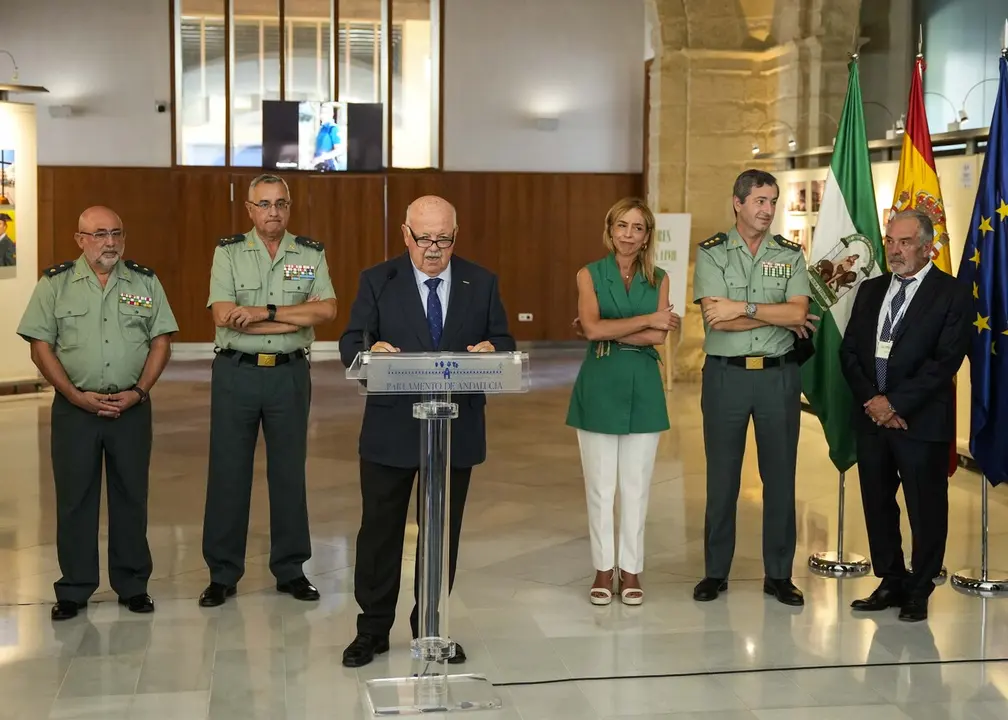 Comisionada por el teniente coronel Esteban Gómez, “nos acerca al agente como un servidor público que vela por el cuidado de la ciudadanía, pero también nos acerca a ese mismo agente como persona normal y corriente, como un vecino de cualquier barriada”, ha destacado el presidente del Parlamento, que ha estado acompañado en el acto por varios diputados y diputadas, por el general jefe de la IV Zona de la Guardia Civil, Luis Ortega, y por la presidenta de la Diputación Provincial de Cádiz, Almudena Martínez, entre otras autoridades.