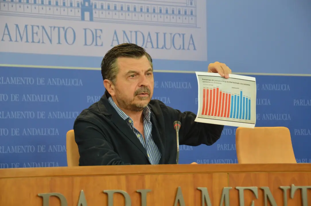 El portavoz del Grupo Popular en el Parlamento de Andalucía, Toni Martín, ha rebatido este miércoles las “mentiras” y “falsedades” que repite una y otra vez la izquierda, y particularmente el PSOE de Andalucía, sobre la privatización de la sanidad pública andaluza. En rueda de prensa, el portavoz ha mostrado un cuadro con la evolución de los porcentajes de conciertos con clínicas privadas en Andalucía entre 2010 y 2025 y ha subrayado que “Gobierno de Juanma Moreno lo que ha sido es un freno a la privatización de la sanidad pública emprendida por el Partido Socialista”, ya que nunca se han alcanzado los niveles de conciertos firmados con clínicas privadas que hubo en la etapa de gobiernos socialistas, ha explicado.