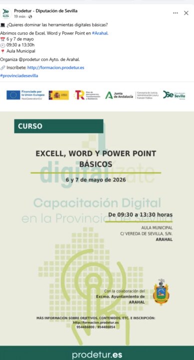 El Ayuntamiento de Arahal, en colaboración con Prodetur de la Diputación de Sevilla, ha anunciado la apertura de una nueva acción formativa centrada en el dominio de herramientas digitales básicas. El curso se impartirá los días 6 y 7 de mayo de 2026, facilitando a los ciudadanos el acceso a competencias tecnológicas clave para el mercado laboral actual. Esta convocatoria se enmarca dentro de los planes de alfabetización digital que recorren la provincia para reducir la brecha tecnológica en los municipios sevillanos.
