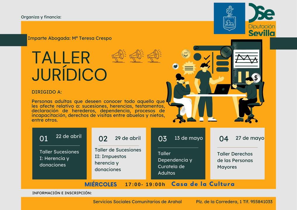 El Ayuntamiento de Arahal, a través del Centro de Servicios Sociales Comunitarios y con la financiación del Área de Cohesión Social e Igualdad de la Diputación de Sevilla, ha puesto en marcha un nuevo taller jurídico destinado a resolver dudas legales y asesorar a la población dentro del marco del envejecimiento activo. La iniciativa busca clarificar los trámites más habituales que afectan a las personas mayores, acercando el derecho civil y administrativo a la ciudadanía de Arahal.