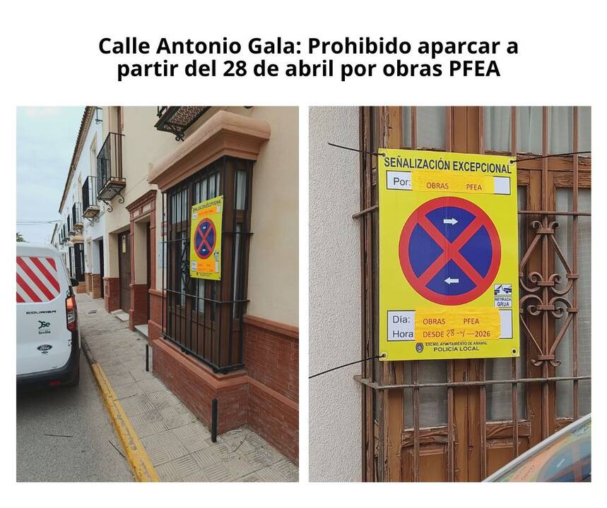 La Policía Local de Arahal ha emitido un aviso urgente a la ciudadanía ante el comienzo de las obras de mejora integradas en el Plan PFEA, que afectarán de forma directa a la movilidad en el casco urbano. A partir de la próxima semana, el estacionamiento quedará estrictamente prohibido en las calles Antonio Gala y Barriete para permitir el acceso de la maquinaria y el desarrollo de los trabajos técnicos. Las restricciones se aplicarán de manera escalonada, comenzando el lunes 28 de abril en la primera de las vías afectadas, con el objetivo de renovar las infraestructuras básicas y el pavimento de estas zonas residenciales de Arahal.