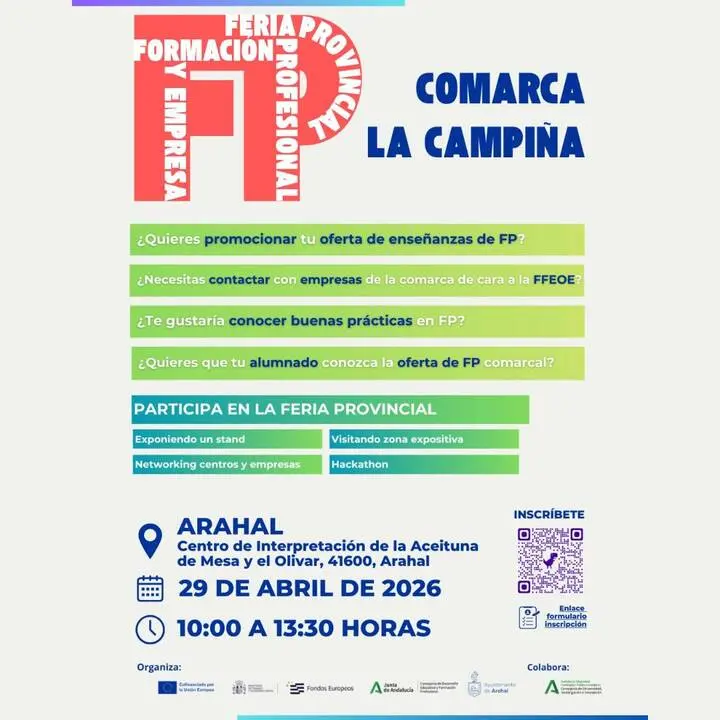 Durante la jornada, que se desarrollará en horario de 10:00 a 13:30 horas, participarán entidades acreditadas, centros educativos y diversas organizaciones vinculadas a la FP en los municipios de La Campiña. El programa del evento incluye una zona expositiva con stands, espacios dedicados al networking, prácticas en vivo y talleres formativos. Asimismo, se celebrará un hackathon impulsado por Andalucía Emprende, Fundación Pública Andaluza, con el fin de estimular el espíritu innovador de los asistentes.