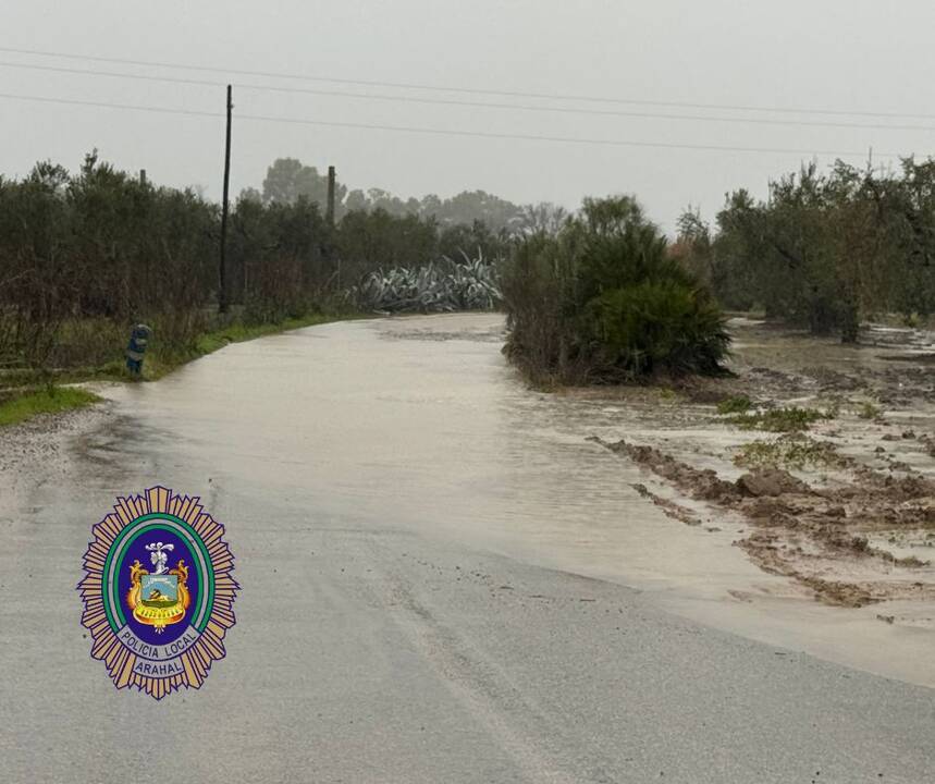 La Policía Local de Arahal ha vuelto a cortar el camino de acceso a la urbanización de Llanoverde tras el desbordamiento de los arroyos Alameda y Buitrero, provocado por una tormenta registrada en las últimas horas en el municipio.