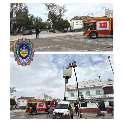 Bomberos y Policía Local actúan en Arahal para evitar un desprendimiento en un semáforo del barrio de La Venta