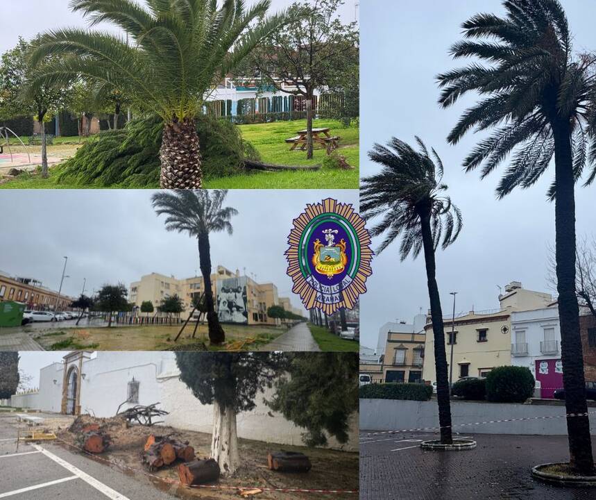 En el polígono Vereda de Osuna, frente al yacimiento arqueológico, otra palmera ha tenido que ser apuntalada de manera preventiva, mientras que un árbol ha caído en el parque junto a la Guardería Campanilla y otro en el parque de San Antonio.