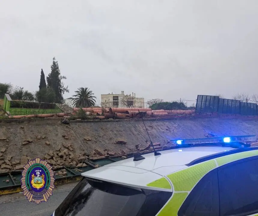 El viento también ha provocado la caída de al menos veinte metros del muro de un almacén municipal ubicado en la avenida Virgen de los Dolores, en las inmediaciones de la estación ferroviaria. El desprendimiento ha generado una situación de peligro en el entorno, por lo que se ha reforzado la vigilancia y se han activado las medidas necesarias para asegurar la zona afectada.