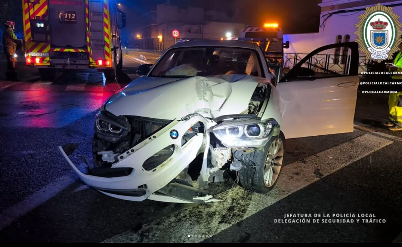 La noche del 2 de noviembre, agentes de la Policía Local de Carmona intervinieron en un accidente de tráfico registrado en el término municipal, junto con los servicios sanitarios y bomberos. A su llegada, comprobaron que uno de los ocupantes del vehículo presentaba heridas, siendo trasladado al hospital con pronóstico reservado.
