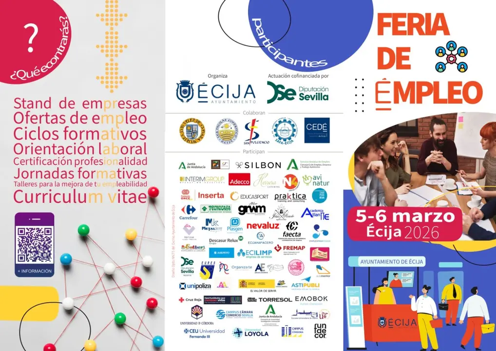 La Feria de Empleo de Écija ofrecerá stands de empresas, ofertas de trabajo, recursos formativos y servicios de orientación laboral. También habrá información sobre certificaciones de profesionalidad y se desarrollarán talleres prácticos pensados para reforzar las competencias de las personas participantes.