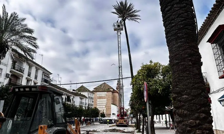 El Ayuntamiento de Écija ha procedido este martes a la tala preventiva de una palmera datilera de gran porte, ubicada en la plaza Giles y Rubio, en el barrio del Puente, ante el riesgo que presentaba para la seguridad ciudadana tras los recientes episodios de viento intenso.