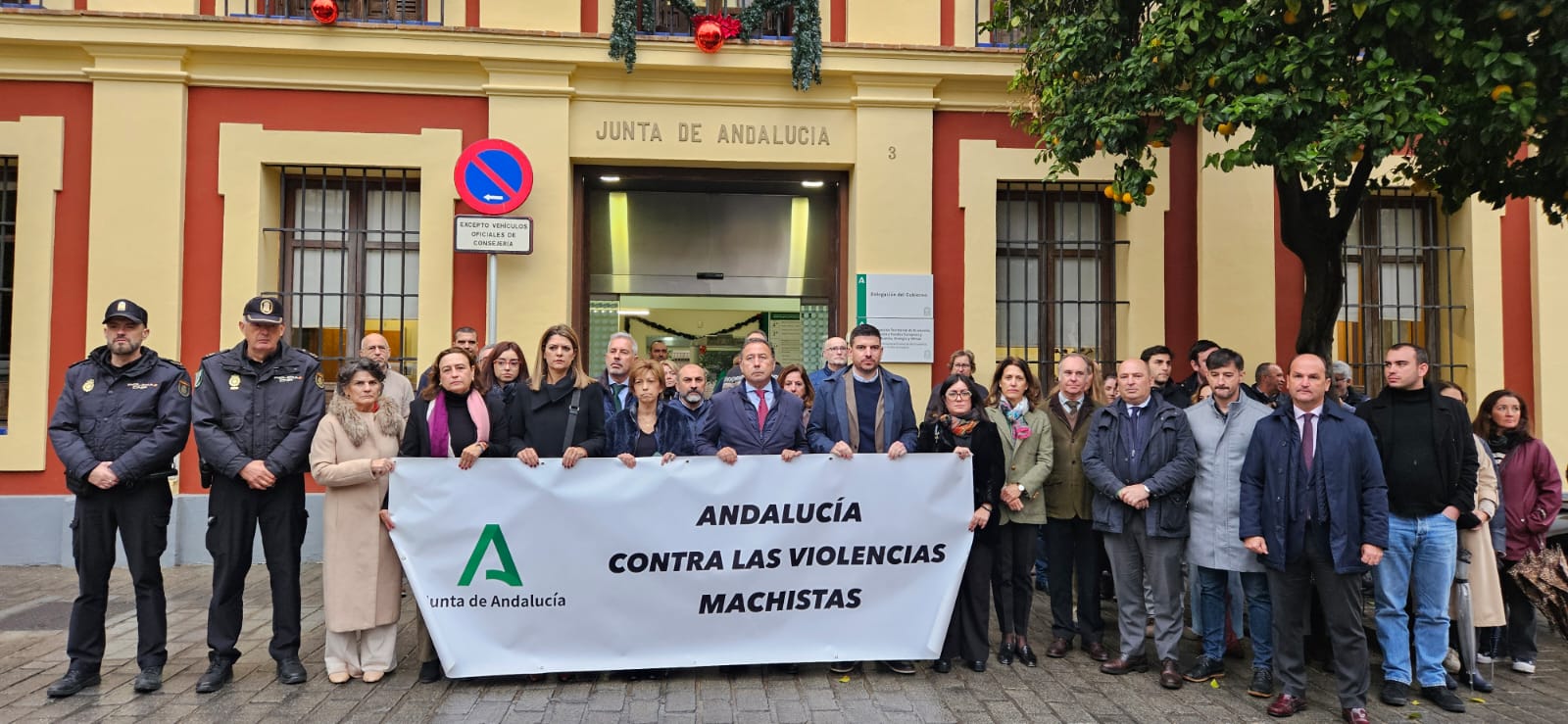 El delegado del Gobierno de la Junta de Andalucía en Sevilla, Ricardo Sánchez, junto a la directora del Instituto Andaluz de la Mujer (IAM), Olga Carrión, el alcalde de El Viso del Alcor, Gabriel Santos, y delegados territoriales de la Junta en Sevilla, ha mantenido hoy en la Delegación del Gobierno de la Junta en Sevilla, un minuto de silencio por la última muerte de violencia machista en El Viso del Alcor (Sevilla).