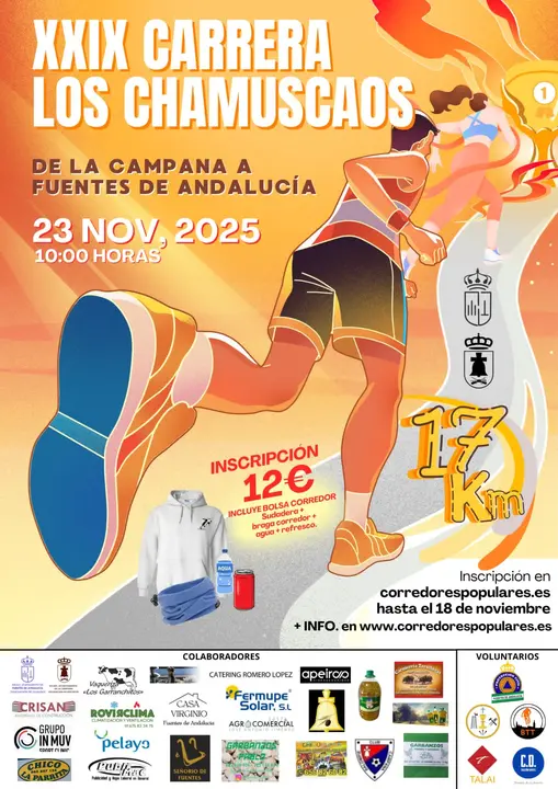 Fuentes de Andalucía volverá a ser el punto de llegada de la XXIX Carrera Popular ‘Los Chamuscaos’, que se celebrará el domingo 23 de noviembre a partir de las 10:00 horas. La cita, una de las más destacadas del calendario atlético de la comarca, unirá los 17 kilómetros que separan La Campana y Fuentes de Andalucía.