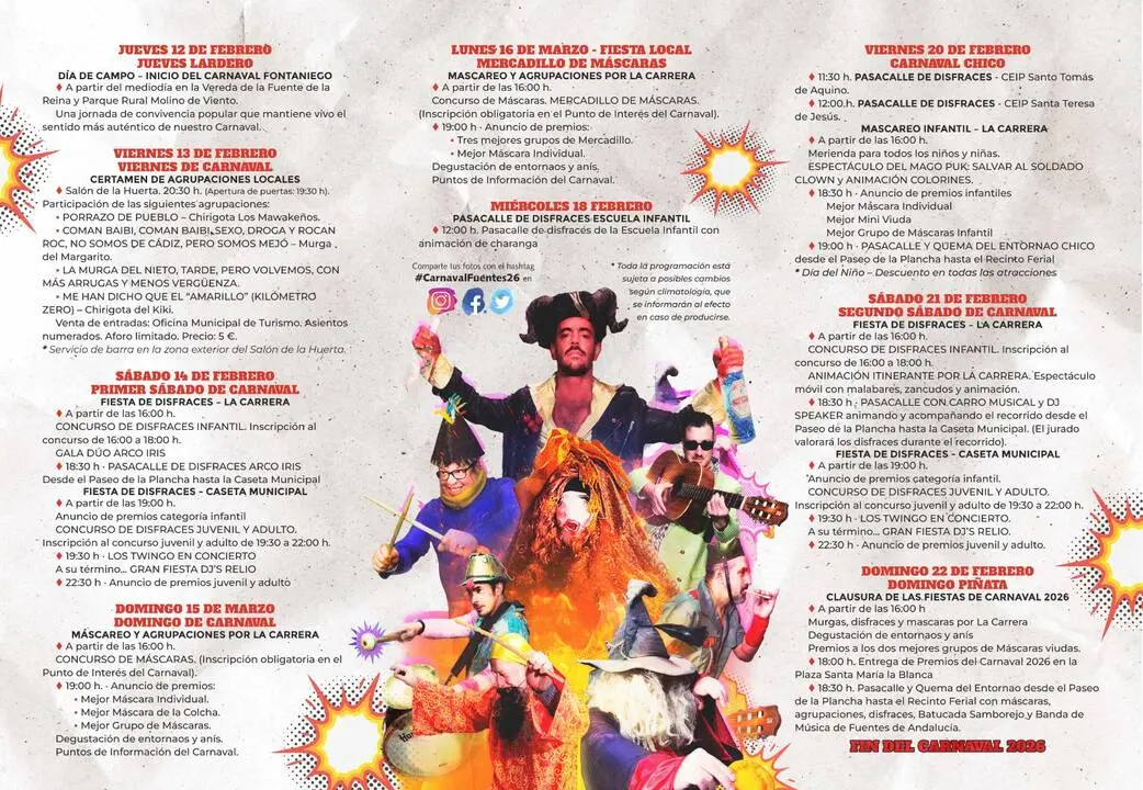 El Carnaval volverá a ser protagonista en Fuentes de Andalucía del 12 al 22 de febrero de 2026, diez días en los que la copla, el ingenio y el arte popular volverán a ocupar plazas y calles con una programación pensada para todos los públicos.