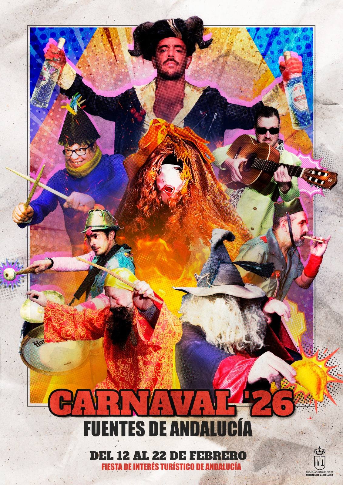 El Ayuntamiento de Fuentes de Andalucía ha presentado oficialmente el cartel anunciador del Carnaval 2026, una cita que se celebrará del 12 al 22 de febrero, desde el tradicional Jueves Lardero hasta el Domingo de Piñata. El acto tuvo lugar en el vestíbulo del Ayuntamiento y sirvió como pistoletazo de salida simbólico a una de las fiestas más singulares y queridas del calendario local.
