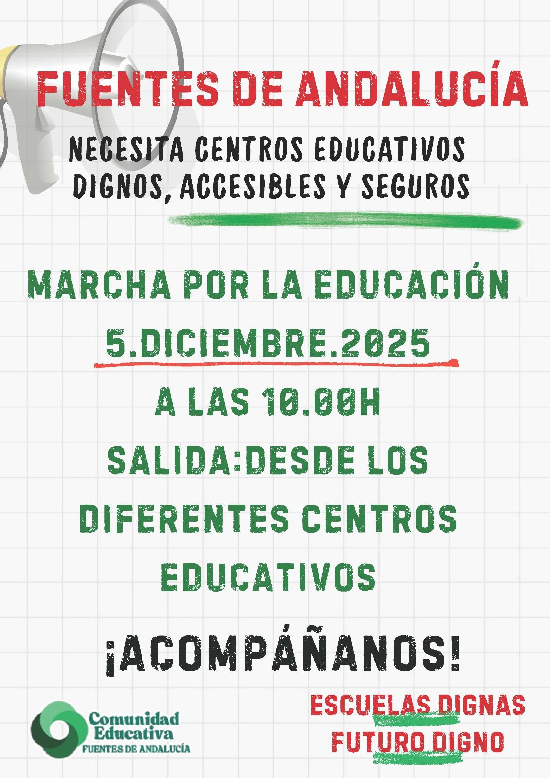 La Comunidad Educativa de Fuentes de Andalucía ha convocado a toda la ciudadanía a participar en la Marcha por la Educación, que tendrá lugar el próximo 5 de diciembre de 2025 a las 10:00 horas, con salida desde los distintos centros educativos del municipio.