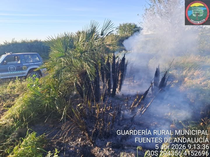 La rápida intervención de la Guardería Rural ha evitado este domingo un grave daño ecológico en Fuentes de Andalucía al sorprender in fraganti a un individuo mientras provocaba un fuego. El incidente, que afectó directamente a varios ejemplares de palmito, una especie estrictamente protegida por la legislación autonómica, fue neutralizado en el acto por los propios agentes.