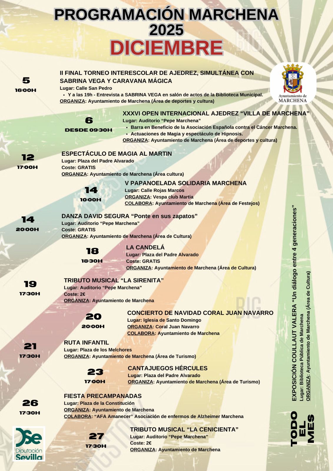 Marchena prepara un mes de diciembre lleno de actividad con una programación municipal que abarca cultura, deporte, música y propuestas solidarias distribuidas a lo largo de todo el mes. Los eventos tendrán lugar en distintos espacios de la localidad, desde el auditorio ‘Pepe Marchena’ hasta plazas y calles del municipio.