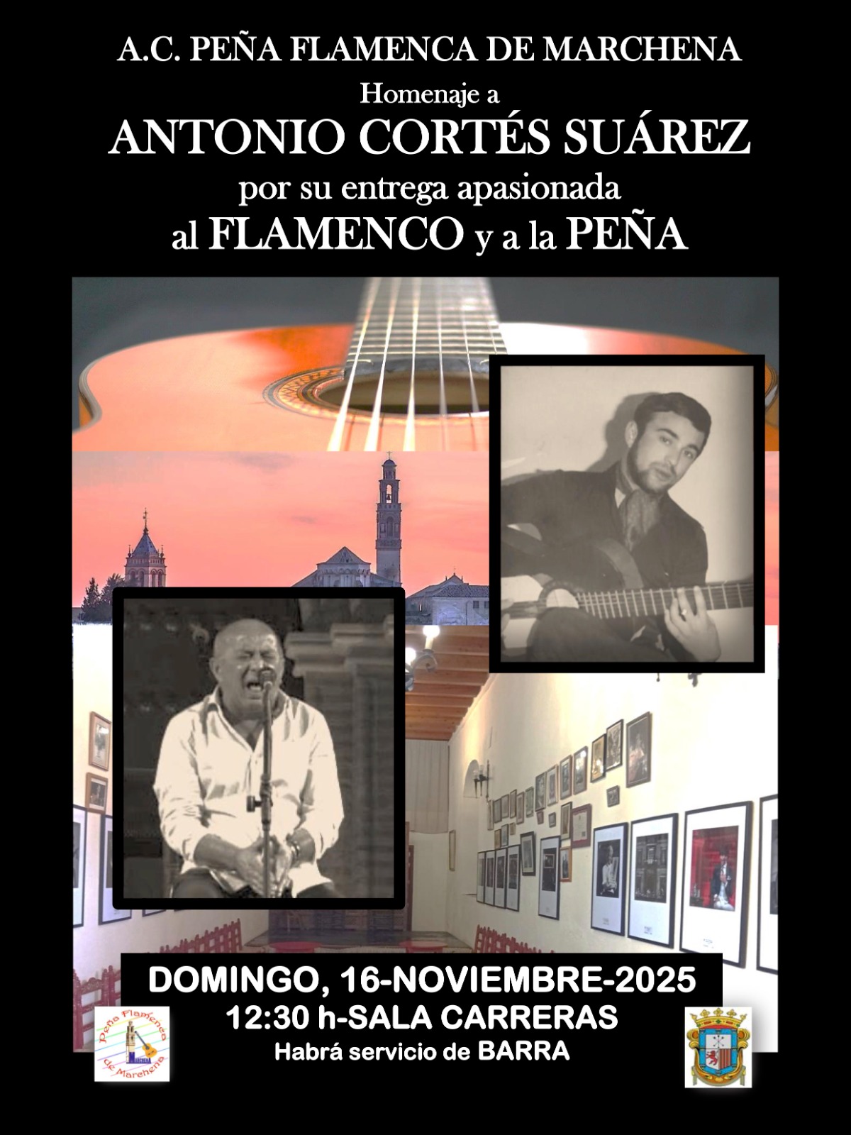 La Peña Flamenca de Marchena rendirá homenaje este domingo 16 de noviembre, coincidiendo con la celebración del Día Internacional del Flamenco, al artista marchenero Antonio Cortés Suárez, figura destacada por su pasión, compromiso y entrega al arte jondo y a la peña.