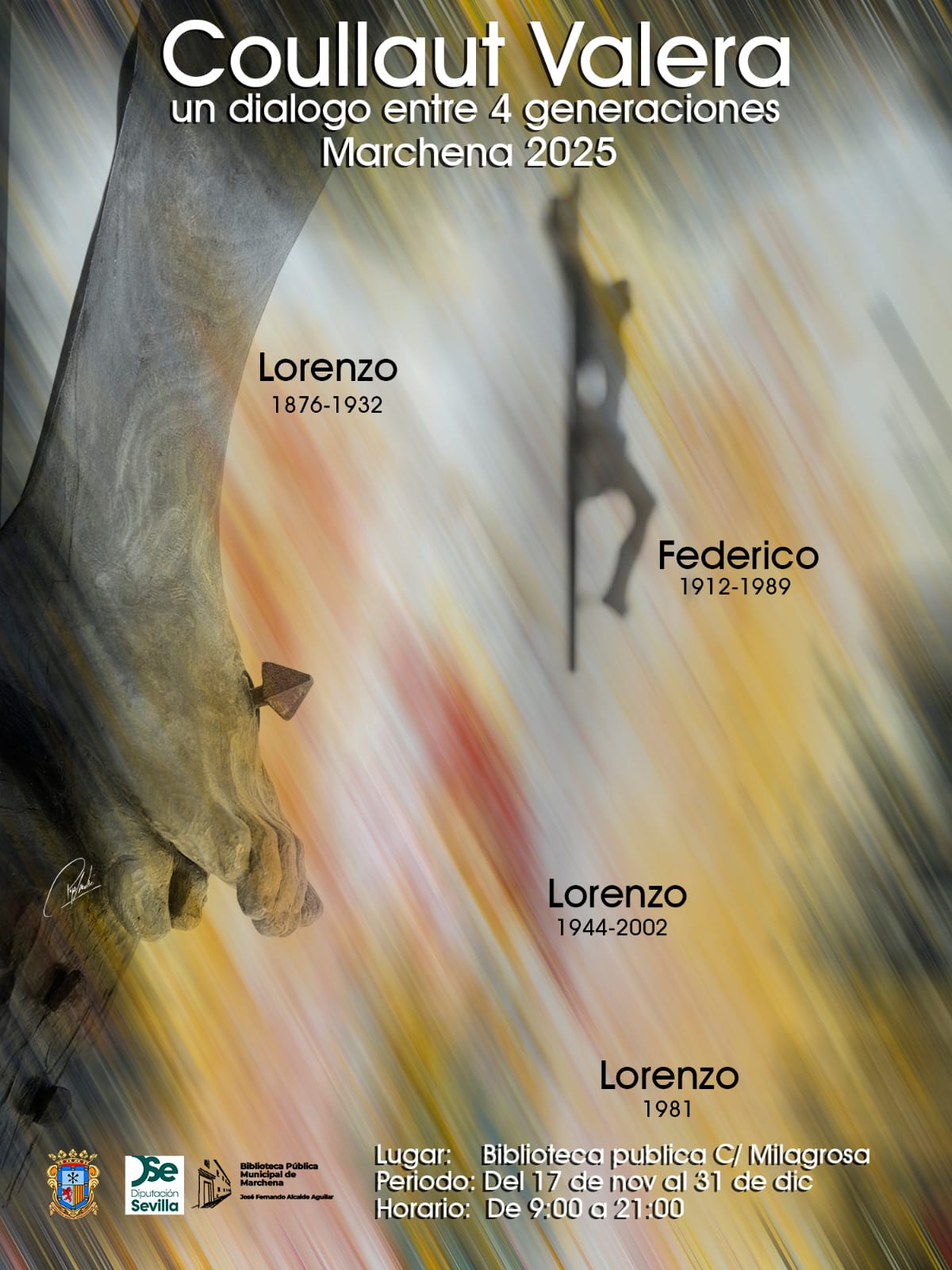 Marchena acoge desde el 17 de noviembre una exposición excepcional dedicada a la saga escultórica Coullaut Valera, una familia cuya trayectoria ha marcado distintas etapas del arte andaluz. La muestra, instalada en la Biblioteca Pública Municipal 'José Fernando Alcaide Aguilar', reúne obras de cuatro generaciones que reinterpretan la figura del crucificado desde sensibilidades y técnicas muy diferentes.