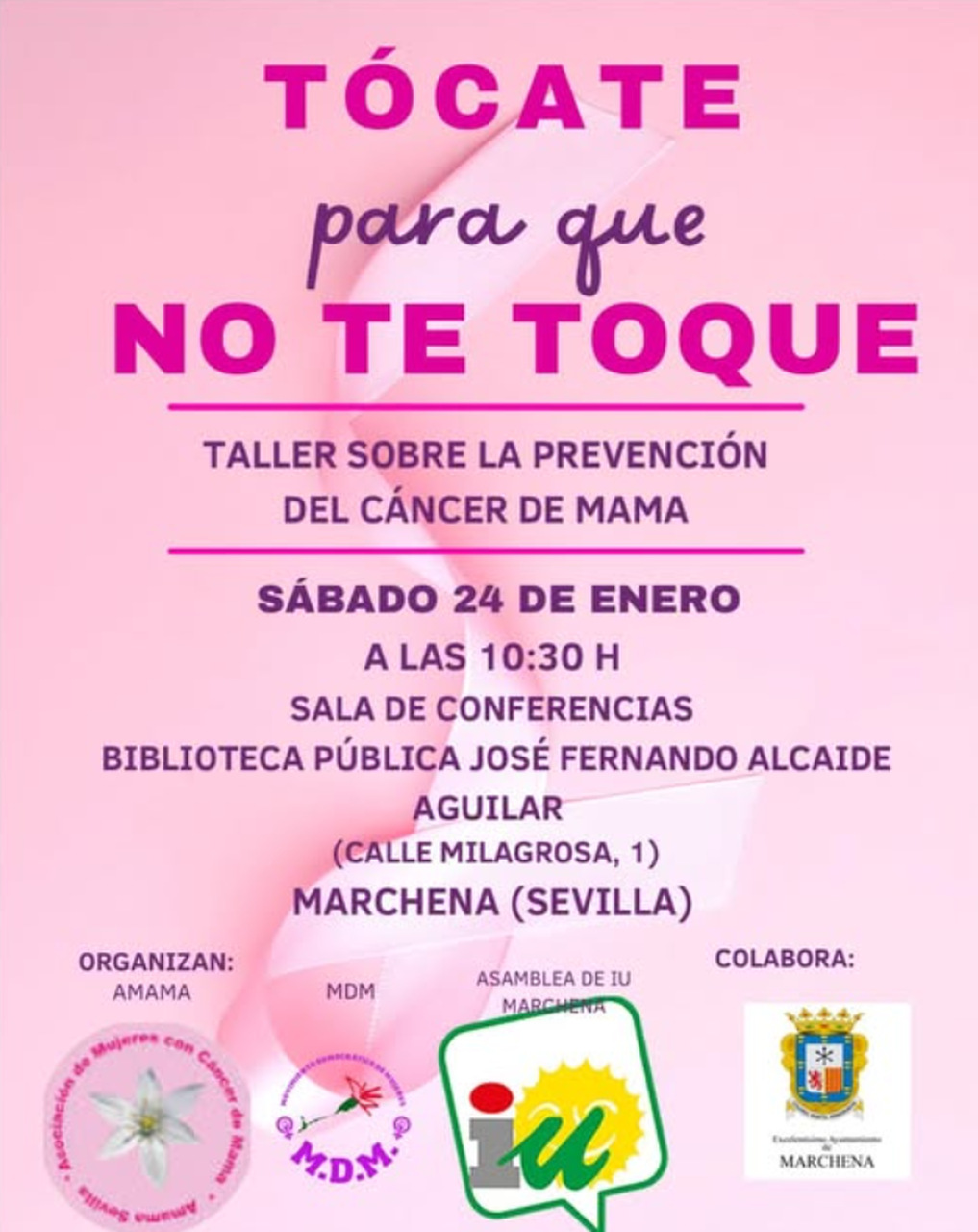 Marchena acogerá el próximo sábado 24 de enero un taller sobre la prevención del cáncer de mama bajo el título ‘Tócate para que no te toque’. La actividad se celebrará a las 10:30 horas en la sala de conferencias de la Biblioteca Pública José Fernando Alcalde Aguilar, situada en la calle Milagrosa, 1.