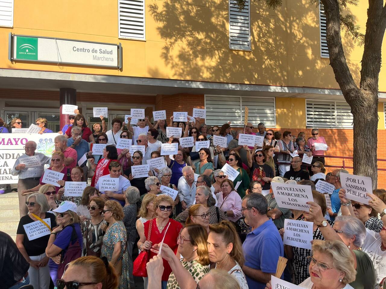 Con cánticos y reivindicaciones como "Sanidad Pública", "Pediatras en Marchena", "Citas presenciales", "Médicos en Marchena", casi un millar de personas han querido mostrar su disconformidad con el actual estado del Centro de Salud del municipio y la gestión de la Junta de Andalucía con la sanidad pública. Desde niños pequeños hasta los más mayores han ocupado gran parte de la Avenida Maestro Santos Ruano, cortando el tráfico, para participar en un evento multitudinario que viene a expresar el hartazgo que el pueblo de Marchena tiene ya con su Centro de Salud.