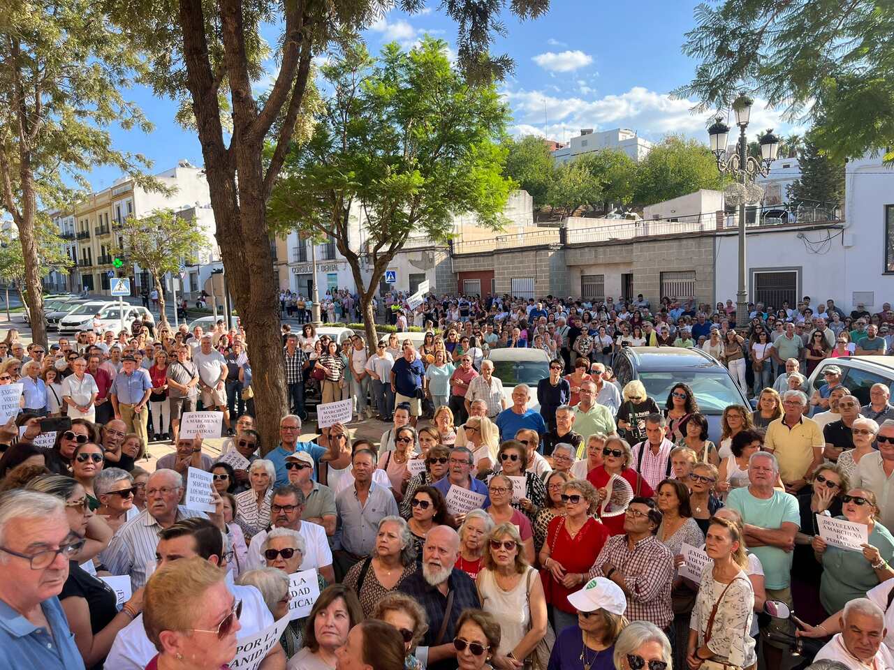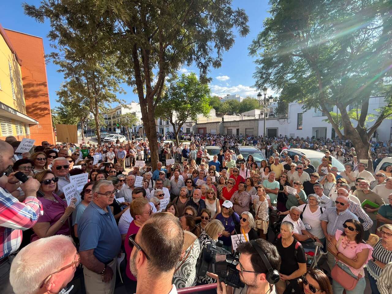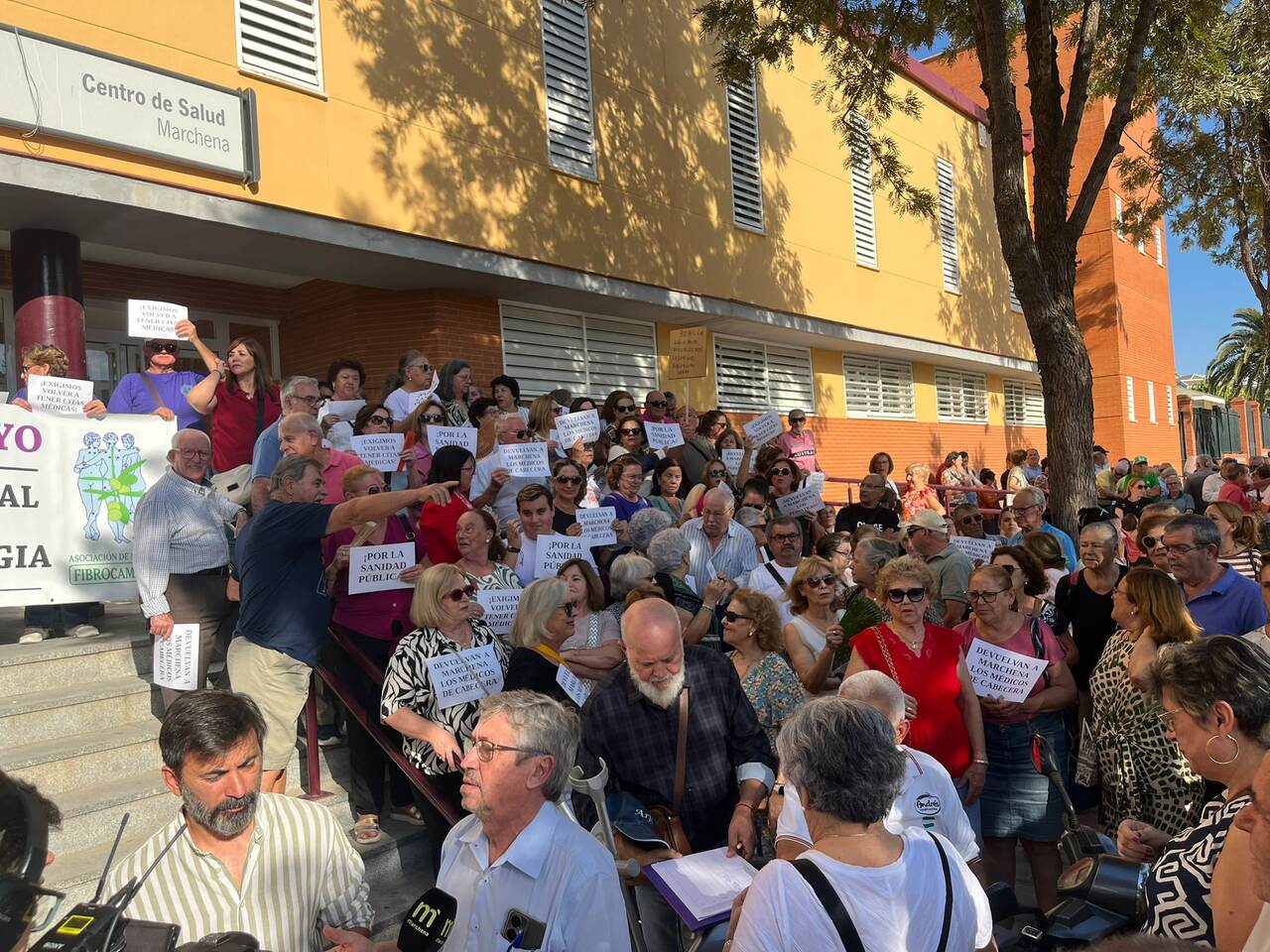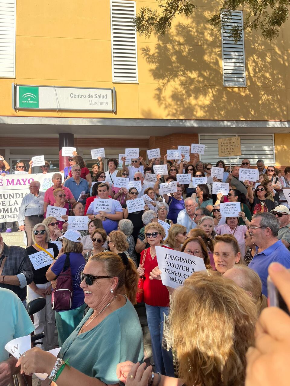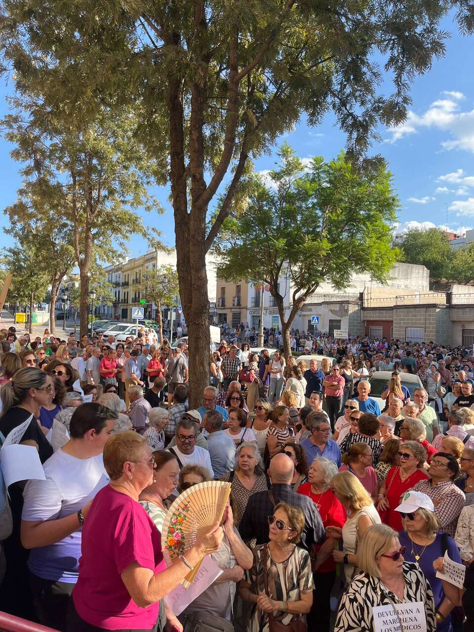 Casi un millar de marcheneros se han dado cita en esta calurosa tarde de octubre para protestar por la crítica situación del Centro de Salud de la localidad. A las cinco de la tarde estaba convocada la ciudadanía para la defensa de la sanidad pública en un acto convocado por el PSOE de Marchena, pero que, según ha remarcado la alcaldesa, María del Mar Romero, no es algo partidista, sino que afecta a todos. A la concentración ha asistido, además de la alcaldesa, la diputada del PSOE en el Parlamento de Andalucía, Verónica Pérez, concejales de los distintos grupos municipales, asociaciones y el pueblo de Marchena.
