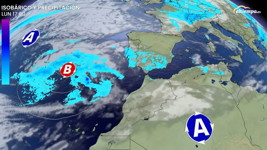 Desde el lunes las lluvias comenzarán a llegar por el suroeste peninsular, al acercarse una borrasca. El martes se acercará aún más y las lluvias podrían avanzar por gran parte del oeste de la península. Esta borrasca entraría de lleno el miércoles y las lluvias serían casi generalizadas.