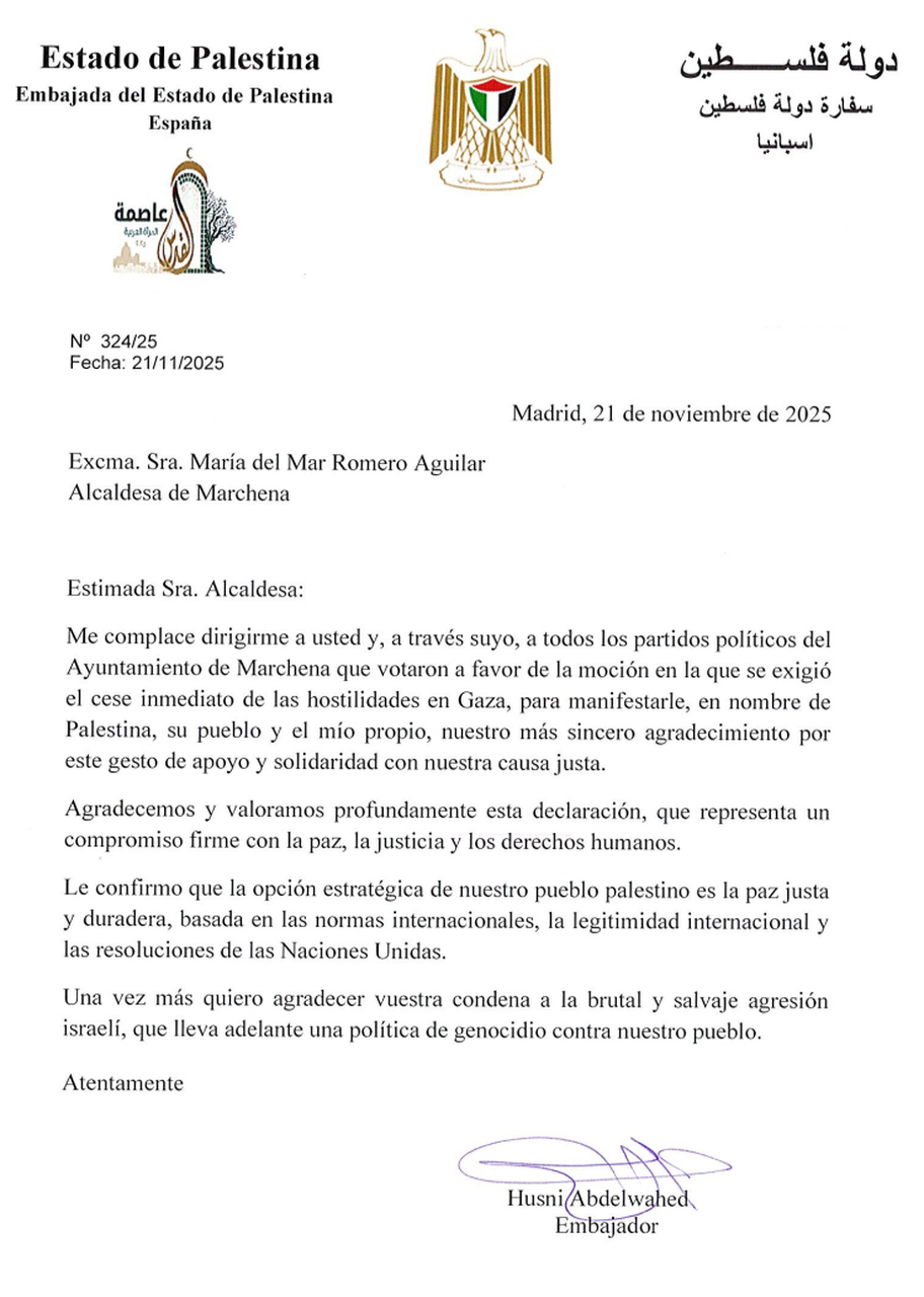 La carta también agradece expresamente la condena recogida en la moción municipal frente a la ofensiva israelí en Gaza. El embajador afirma que decisiones institucionales como la adoptada por Marchena ayudan a dar visibilidad internacional a la situación y fortalecen la demanda de un alto el fuego y de protección para la población civil.