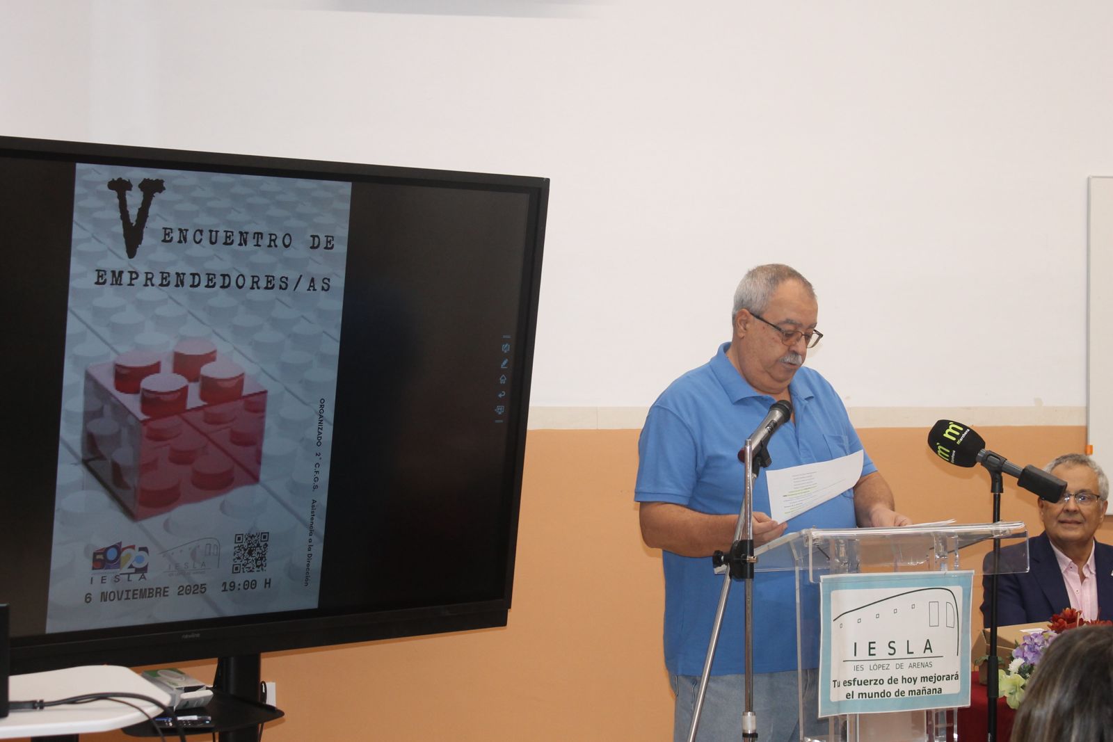 La apertura del acto corrió a cargo del profesor Juan A. Zambrano, quien subrayó la relevancia del encuentro y recordó los logros de quienes han pasado por el centro. “Es un verdadero honor estar hoy aquí, rodeado de tantas personas que han formado parte de la historia viva del instituto ‘López de Arenas’”, señaló. Zambrano evocó ejemplos de emprendimiento surgidos en el propio centro, como la cooperativa Macelca S. Coop. And., galardonada con el Premio Arco Iris en 1991, y recordó el reconocimiento recibido por el centro en 2021 como Instituto Emprendedor del Año por la Junta de Andalucía.