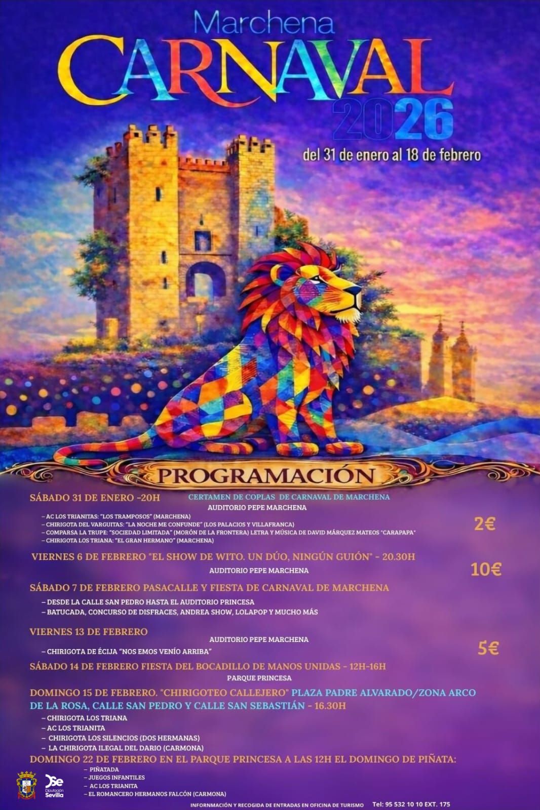 Marchena ya tiene definida la programación del Carnaval 2026, una cita que volverá a llenar las calles y los espacios culturales del municipio de música, humor y ambiente festivo entre finales de enero y el mes de febrero, con propuestas pensadas para todos los públicos.
