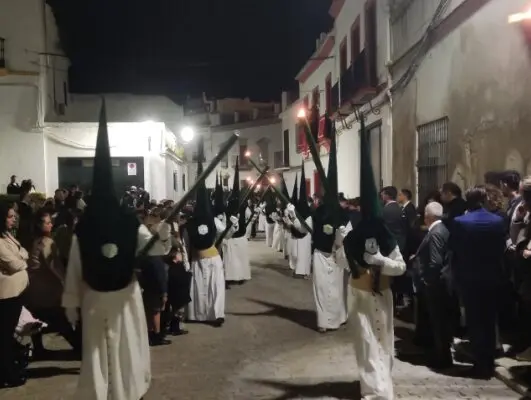 A las 22:00 horas de la noche de este Jueves Santo ha salido puntual la Cruz de guía de la Hermandad de la Vera Cruz de Marchena de la Capilla de la calle San Francisco. "Coge tu cruz y sígueme", se puede leer en esa imponente cruz que da inicio a una cofradía seria, de recogimiento y cargada de simbolismo que ha vuelto a dejar estampas sobrecogedoras en la Semana Santa marchenera.