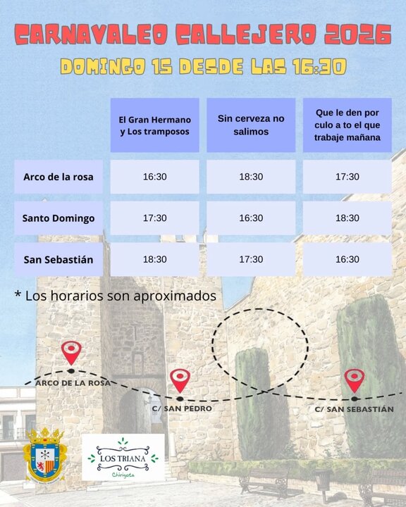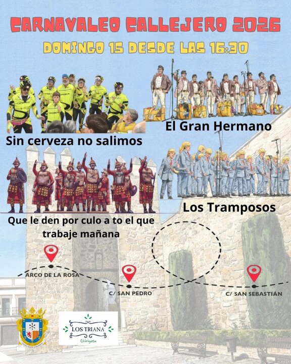 El domingo 15 de febrero llegará uno de los momentos más esperados con el chirigoteo callejero. Las actuaciones se repartirán entre la Plaza Padre Alvarado, la zona del Arco de la Rosa y distintas calles del centro histórico. En esta jornada participarán agrupaciones como Los Trianita, AC Los Trianita, la Chirigota Los Silencios de Dos Hermanas y la Chirigota Ilegal del Darío de Carmona.