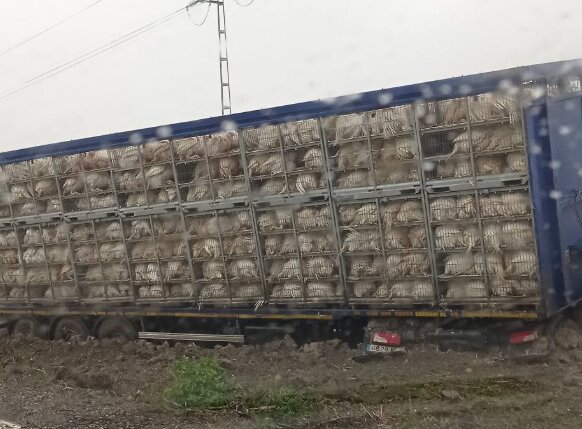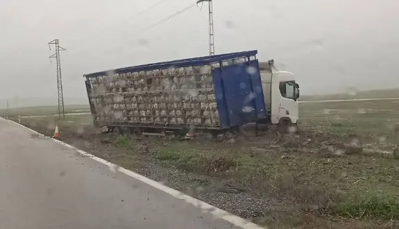 Según ha reportado el usuario Juan Manuel Casado en redes sociales, ya habrían sido dos los camiones cargados de pavos que han volcado en la carretera de Carmona a Marchena, saliéndose de la vía por el fuerte viento.