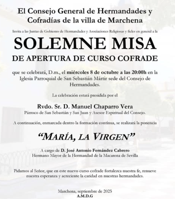 El Consejo General de Hermandades y Cofradías de Marchena celebrará el próximo miércoles 8 de octubre la misa de apertura del curso cofrade. La cita tendrá lugar a las 20:00 horas en la Iglesia Parroquial de San Sebastián Mártir, sede del Consejo.
