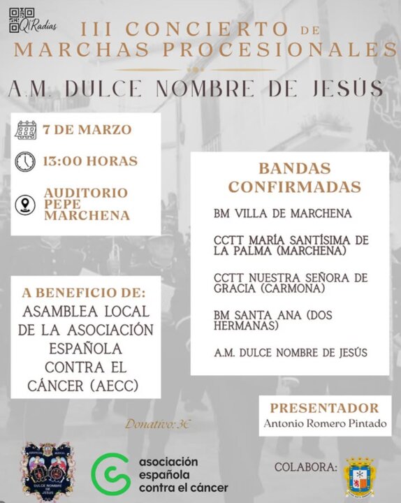El sábado 7 de marzo, a las 13:00 horas, el Auditorio Pepe Marchena acogerá el III Concierto de Marchas Procesionales organizado por la Agrupación Musical Dulce Nombre de Jesús de Marchena.