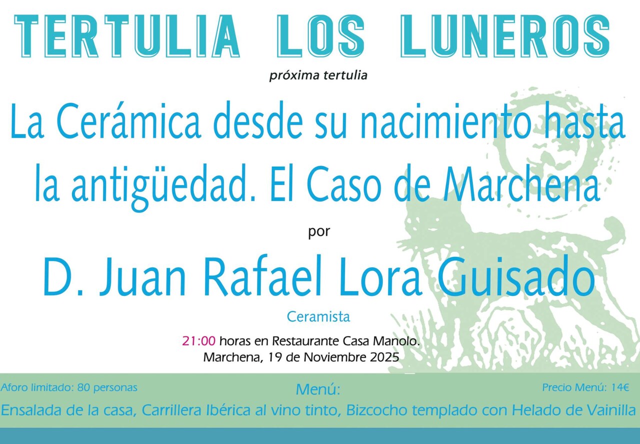 La tertulia cultural ‘Los Luneros’ celebrará el próximo 19 de noviembre en Marchena una nueva sesión dedicada a la cerámica, desde sus orígenes hasta la Antigüedad, con especial atención al caso local. El ceramista Juan Rafael Lora Guisado será el encargado de impartir la conferencia a las 21:00 horas en el restaurante Casa Manolo, con aforo limitado a 80 personas.