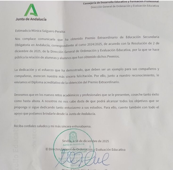 La Consejería de Desarrollo Educativo y Formación Profesional ha concedido un reconocimiento oficial a Mónica Salguero Peralta, alumna del instituto 'López de Arenas' de Marchena, por su trayectoria académica excepcional durante la etapa de Educación Secundaria Obligatoria.