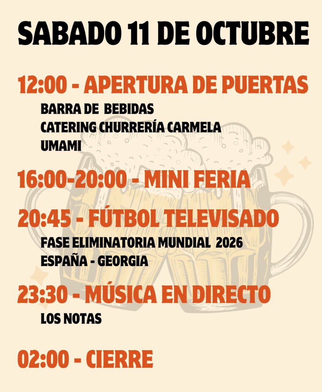 El sábado 11 de octubre las puertas abrirán a las 12:00 horas. Por la tarde, de 16:00 a 20:00 horas, habrá una mini feria para los más pequeños, y a las 20:45 horas se podrá seguir en pantalla grande el partido clasificatorio para el Mundial 2026 entre España y Georgia. La noche continuará con el concierto del grupo 'Los Notas' a partir de las 23:30 horas, con cierre a las 02:00 horas.