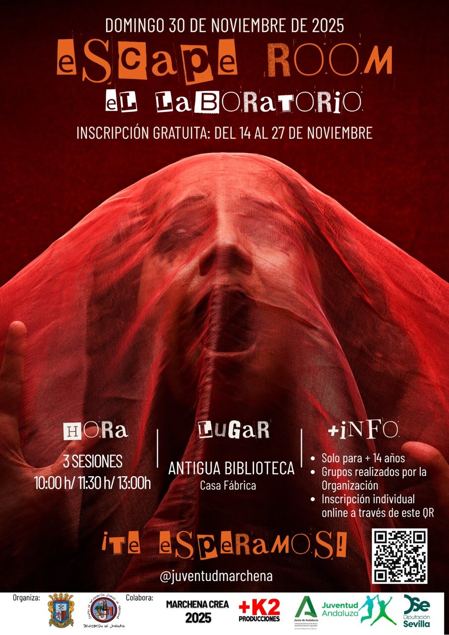 Marchena acogerá el próximo domingo 30 de noviembre el escape room ‘El Laboratorio’, una iniciativa organizada por los jóvenes participantes en el proyecto ‘Marchena Crea 2025’. La actividad se desarrollará en la Casa Fábrica (antigua Biblioteca Municipal) y contará con tres pases a las 10:00, 11:30 y 13:00 horas.