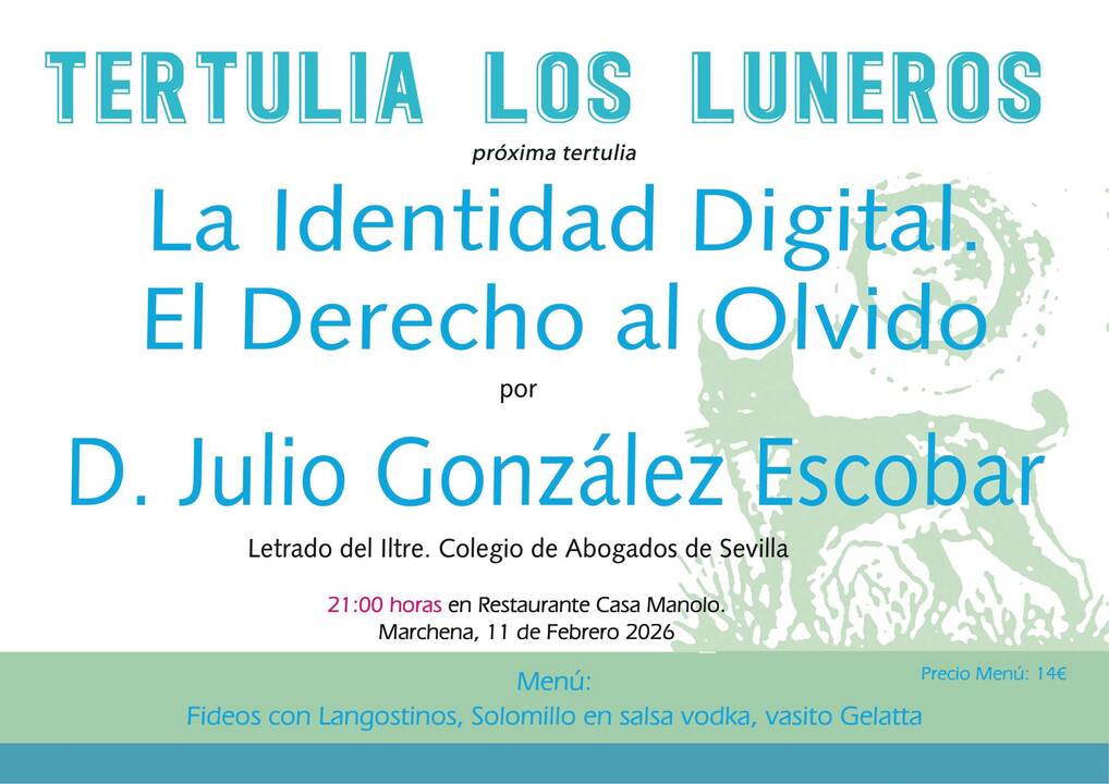 La disertación “La identidad digital y el derecho al olvido”, que se presentará en la Tertulia Los Luneros este miércoles 11 de febrero, abordará cómo nuestra presencia en Internet —perfiles, publicaciones, fotografías, datos indexados y rastros digitales— se ha convertido en una extensión esencial de quiénes somos. La charla explorará los desafíos que plantea esta identidad digital en un mundo donde la información permanece indefinidamente accesible y donde los errores, las noticias antiguas o los datos descontextualizados pueden seguir afectando a una persona muchos años después. Será a las 21:00 horas en el restaurante Casa Manolo de Marchena.
