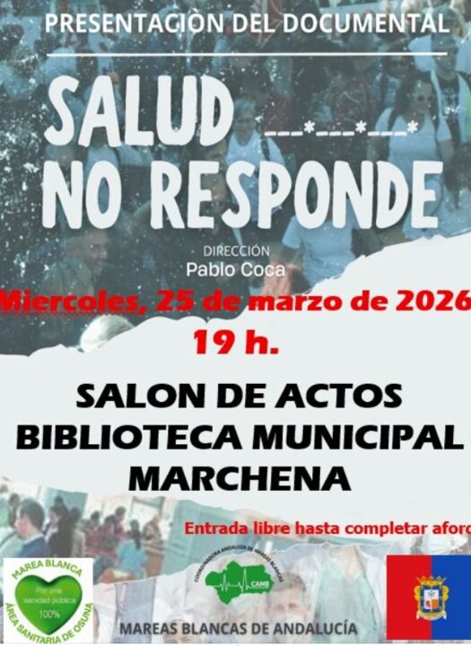 El salón de actos de la Biblioteca Municipal de Marchena será el escenario el próximo miércoles 25 de marzo de 2026 a las 19 horas de la presentación oficial de "Salud no responde". Esta cinta, promovida de manera conjunta por las Mareas Blancas de Andalucía, busca generar reflexión y debate en la localidad de la comarca sobre los retos del sistema público mediante un evento que contará con entrada totalmente libre hasta completar el aforo disponible.