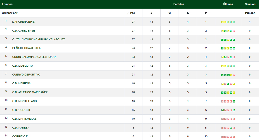 Con esta victoria, el Marchena Balompié alcanza los 27 puntos tras 13 jornadas y se coloca en lo más alto de la clasificación, igualado con otros equipos en cabeza, pero reforzado moralmente tras derrotar al líder en un duelo directo.