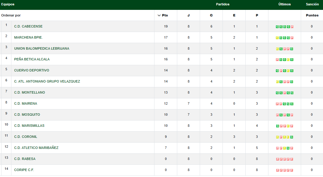 La clasificación sigue mostrando al Marchena Balompié en la parte alta, solo por detrás del Cabecense y con margen sobre los perseguidores. Pese al empate y la derrota, el balance general del equipo continúa siendo muy positivo, con cinco victorias, dos empates y un único partido perdido.