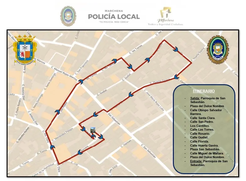 El Ayuntamiento de Marchena ha preparado un plan especial de seguridad vial con motivo de la salida procesional de San Sebastián, patrón de la localidad, que se celebrará este martes 20 de enero a partir de las 17:00 horas desde la parroquia de San Sebastián. El dispositivo, coordinado por la Policía Local y el Área de Movilidad, tiene como objetivo garantizar la seguridad de los asistentes y reducir las afecciones al tráfico en el centro del municipio.