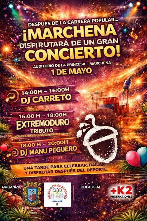 La celebración se trasladará al Auditorio de la Princesa una vez finalizada la carrera, donde la música será la gran protagonista de la tarde. La programación arrancará a las 14:00 horas con la sesión de DJ Carreto, seguida a las 16:00 horas por un esperado tributo a Extremoduro que repasará los grandes éxitos de la banda de rock. El cierre de las actuaciones musicales correrá a cargo de DJ Manu Peguero, quien pinchará desde las 18:00 hasta las 20:00 horas para amenizar el fin de fiesta en un entorno pensado para el disfrute de los deportistas y sus familias.